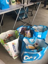 De hele dag komen mensen binnen met grote en kleine tassen vol houdbare producten. Deze worden in kratten verzameld, die naar de voedselbank getransporteerd worden en daar gesorteerd worden.